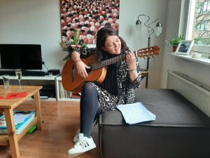 Deze foto is genomen op mijn 49e verjaardag, afgelopen maart. Als je mij twee jaar geleden had gezegd dat ik een instrument zou gaan bespelen, had ik op mijn voorhoofd gewezen. Neen. Ik had geen talent, geen geduld, en bovendien een muziektrauma van de notenleer en zanglessen tijdens mijn PABO-studie. We moesten een lijst met 150 kinderliedjes uit ons hoofd knallen en die tijdens Het Individuele Muziekexamen live en solo zingen. De bekwijlde blokfluit was intussen verruild voor een heus slaginstrument. De liedlijst moesten we ook uit onze metallofoon kunnen rammelen, ding-a-dong, de hel!